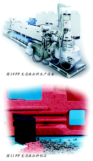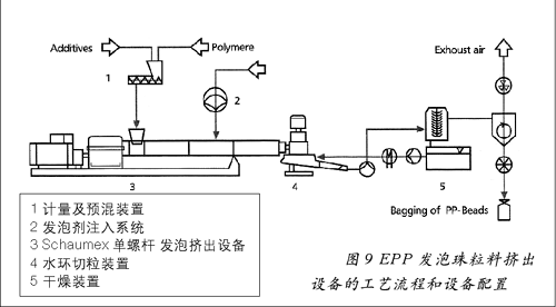 圖8 PP 發(fā)泡珠粒料EPP發(fā)泡珠粒料擠出設備的工藝流程和設備配置如圖9所示,PP發(fā)泡珠粒料生產(chǎn)設備如圖10所示。
