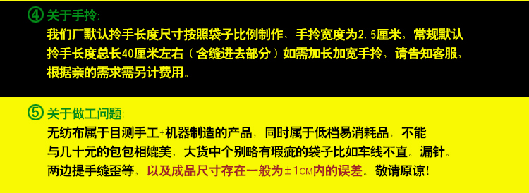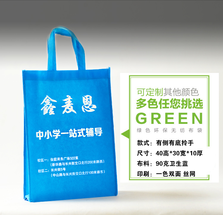注意:我們是生產(chǎn)廠家 只要你提供:材質(zhì)(克數(shù))+規(guī)格尺寸+印刷色+款式或者圖樣等給我們,就可以準(zhǔn)確給您報價和 量身定做,歡迎來電詢價。(網(wǎng)上為象征性標(biāo)價,具體價格請?zhí)峁┮螅?lián)系客服報價。默認(rèn)報價 是不含運費的價格噢!) 訂購須知: 客戶在定制袋子時有以下選擇: 材料:無紡布克重在每平米45克——100克,顏色有幾十種任你選擇; 印刷:絲網(wǎng)印、機器印或者熱轉(zhuǎn)印,單面或者雙面印,單、雙色或多色等; 規(guī)格:規(guī)格可由客戶隨意來定,顧客在定做時,只要告訴我們長寬高,我們將為你量身打造; 款式:本店提供各式各樣的款式,供客戶參考對比。 聯(lián)系電話:15100318595 QQ:546326955
