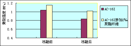 氣溫驟降和低溫環(huán)境下(如北方冬季),一般瀝青路面會發(fā)生收縮或來不及應(yīng)力松弛而產(chǎn)生開裂。若將TB-Fiber纖維加入到瀝青混凝土中,使混合料內(nèi)部具有大量均勻分布縱橫交錯的纖維單絲,使瀝青混合料的彈性提高,使其具有良好的抗變形能力,在低溫下仍保持柔韌性和較高的抗拉強度,有效的抵抗收縮應(yīng)力,減少溫縮裂縫,從而改善了瀝青混凝土的低溫抗裂性能。